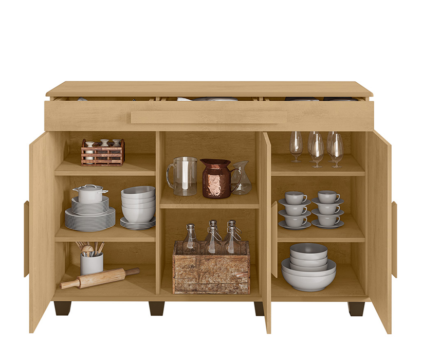 Com três portas e cinco prateleiras amplas, você terá bastante espaço para exibir e guardar objetos decorativos ou utensílios domésticos. Os puxadores em MDF acrescentam elegância, enquanto os oito pés garantem firmeza e evitam contato direto com o chão.