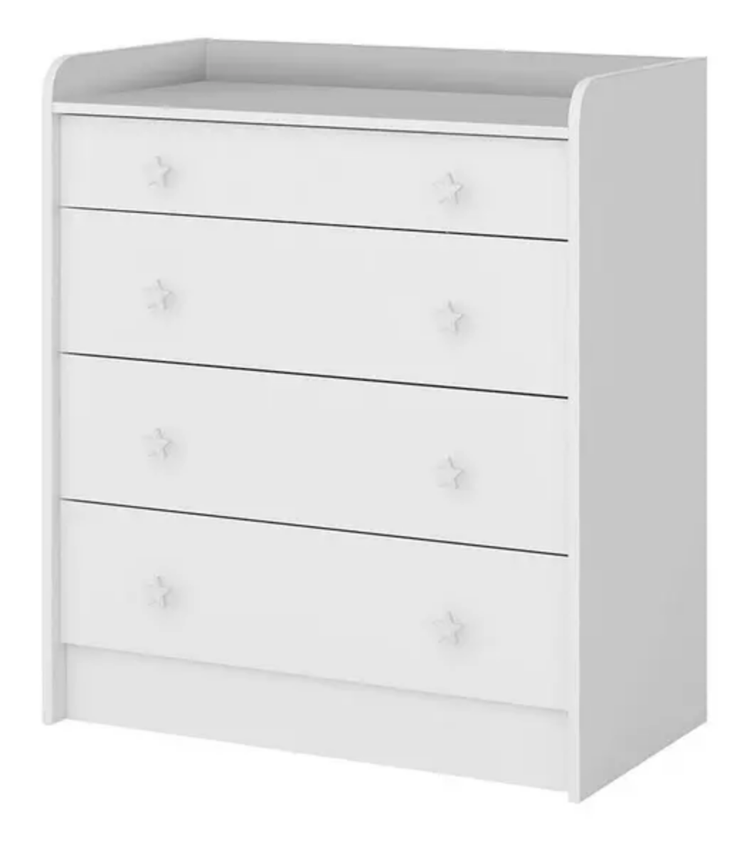Cômoda infantil, conta com um design lindo e sofisticado, deixando o ambiente ainda mais moderno e aconchegante. Estrutura em MDP/MDF de 15mm e 12mm, feita com material ecológicamente correto, para melhor durabilidade e resistência à peça, pintura atóxica livre de materiais pesados, e excelente acabamento UV (Brilho). Composta por 04 gavetas externas com corrediças metálicas, puxadores duplos em plástico com formato de estrela, bordas do tampo com um ótimo acabamento em perfil PVC, e sistema anti-tombamento para evitar riscos de acidentes. Cada gaveta suporta até 5 Kg distribuídos.